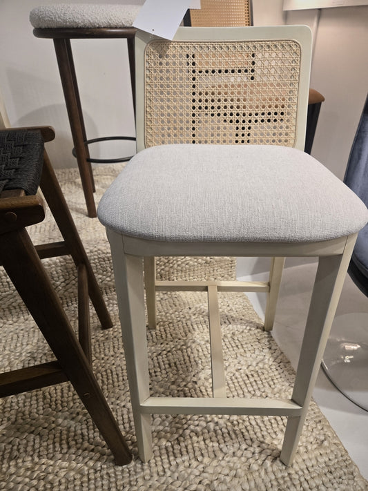 Wood and Rattan Counter Stool in Antique White Natural Heathered Weave Ivory