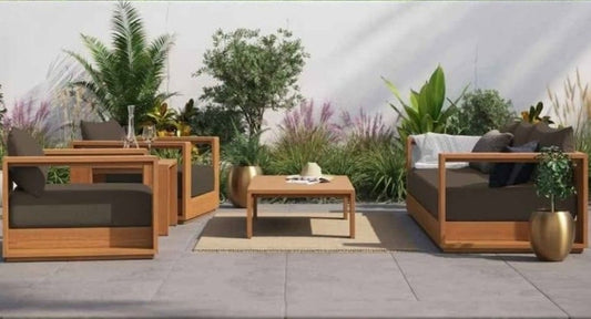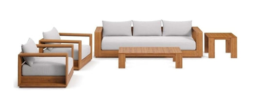 Kuba Solid Teak outdoor Sofa - Grey Performance Olefin beige cushions and slatted back design