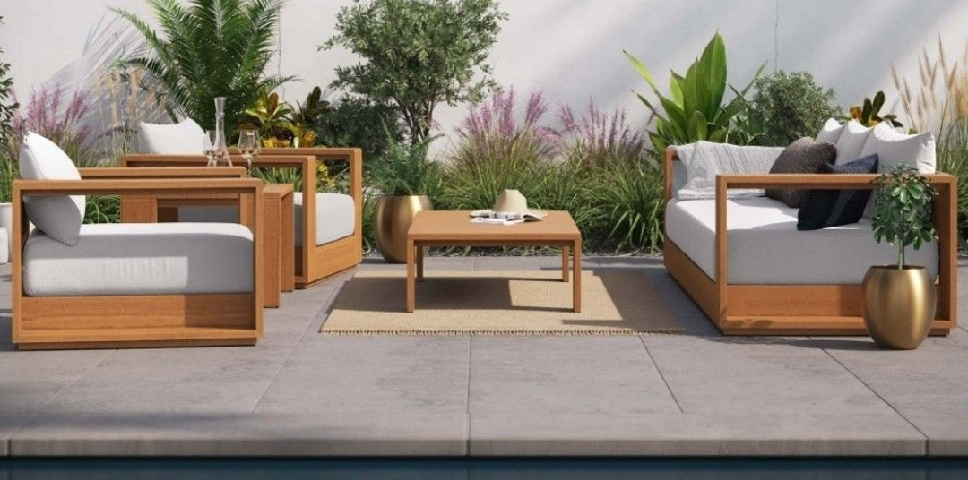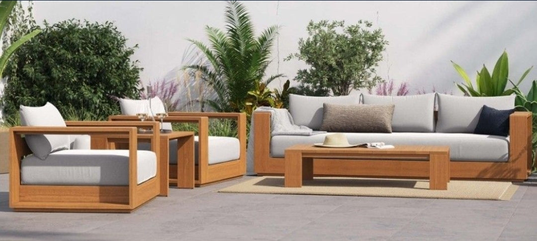 4 piece Outdoor patio Collection Set with light gray all weather cushions FSC certified Acacia Wood