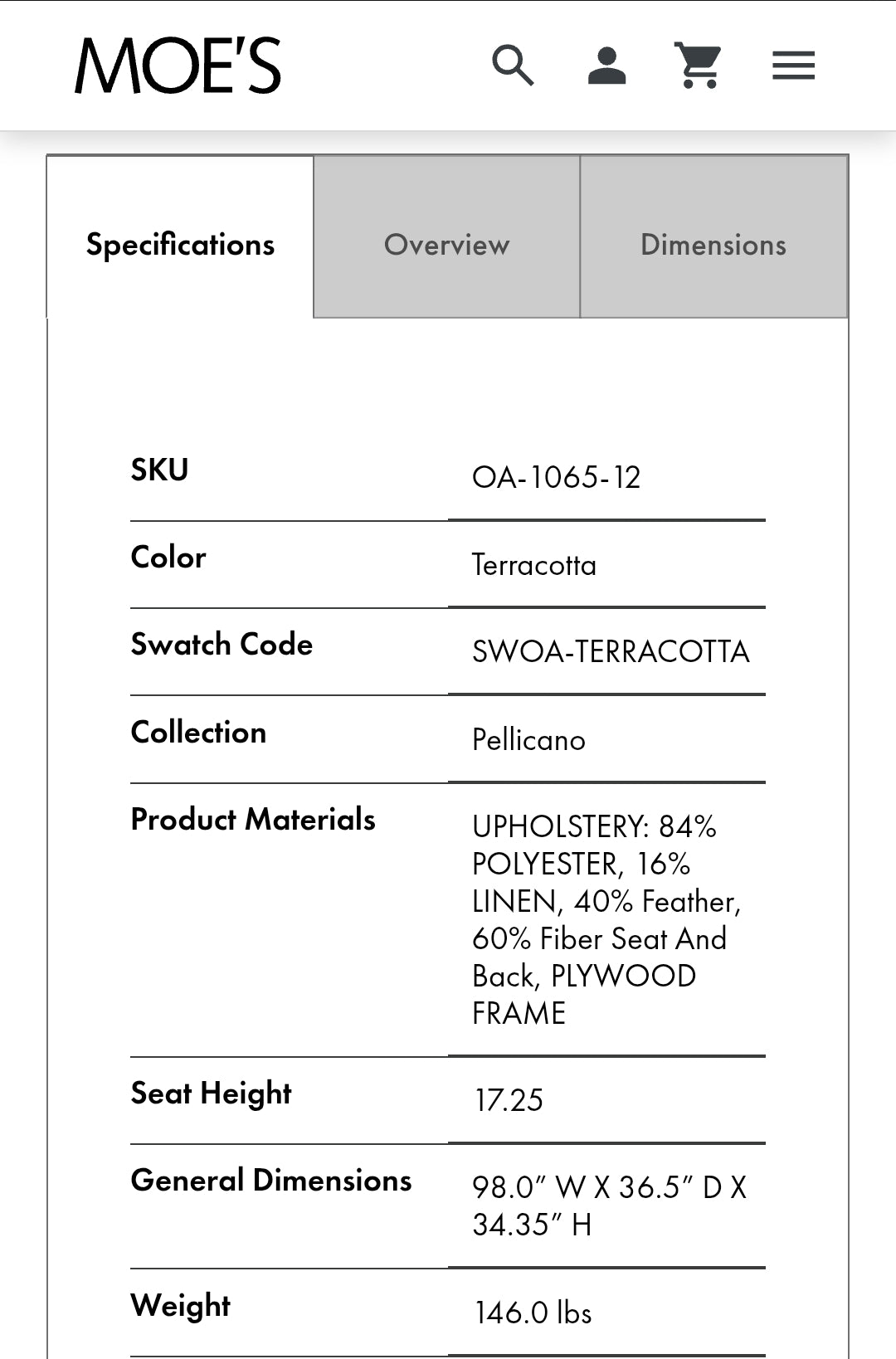 98" W x 36.5" D x 34.35" H