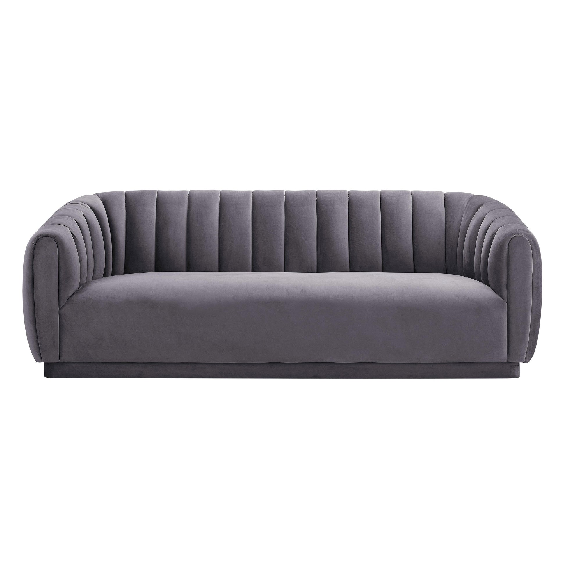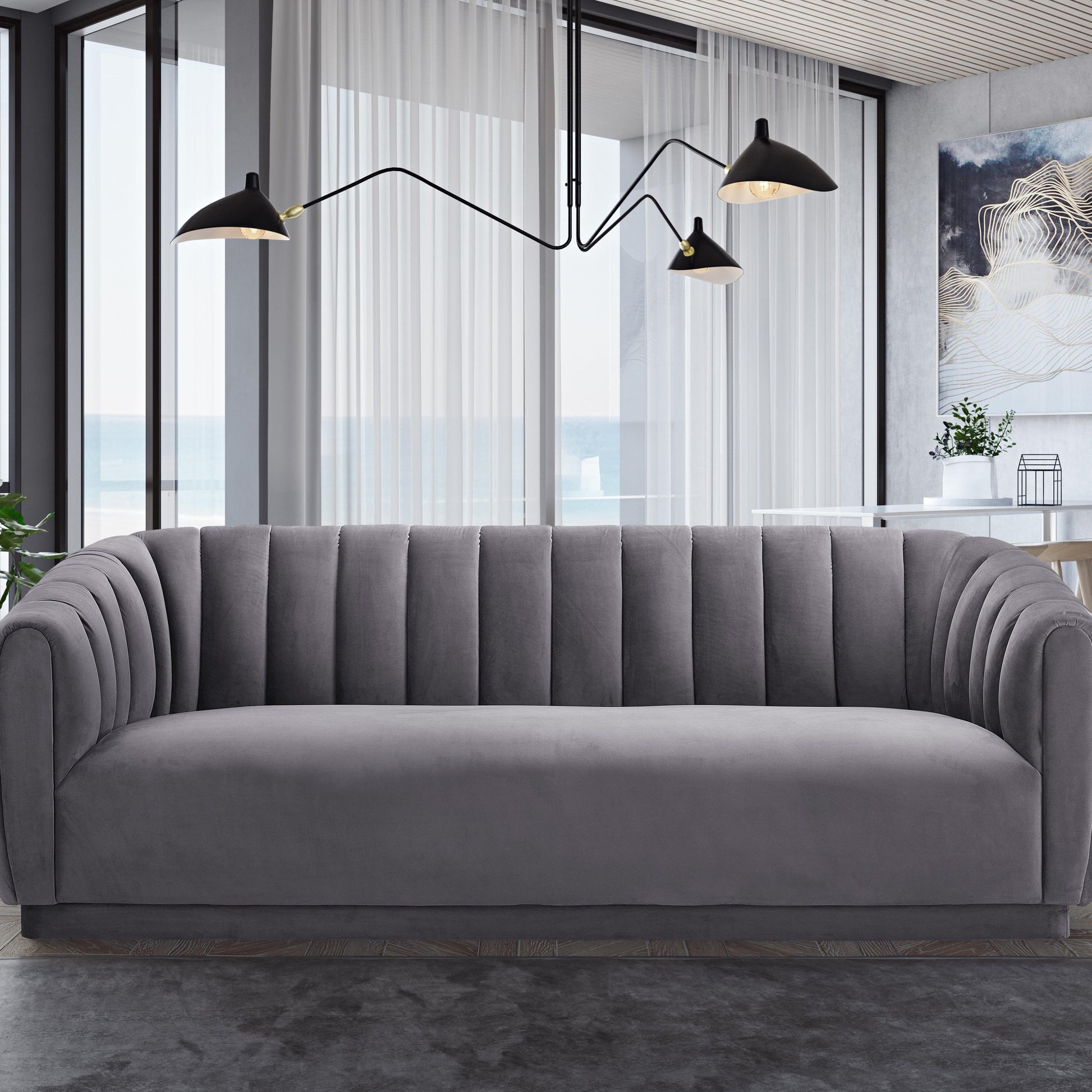 88.2"W x 38"D x 32.5"HTimeless and inviting in lush velvets, the lavish channel tufted Arno sofa is the piece you've been searching for. Upholstered in various sumptuous velvet options this handmade trendsetting sofa will add style and color to any room.