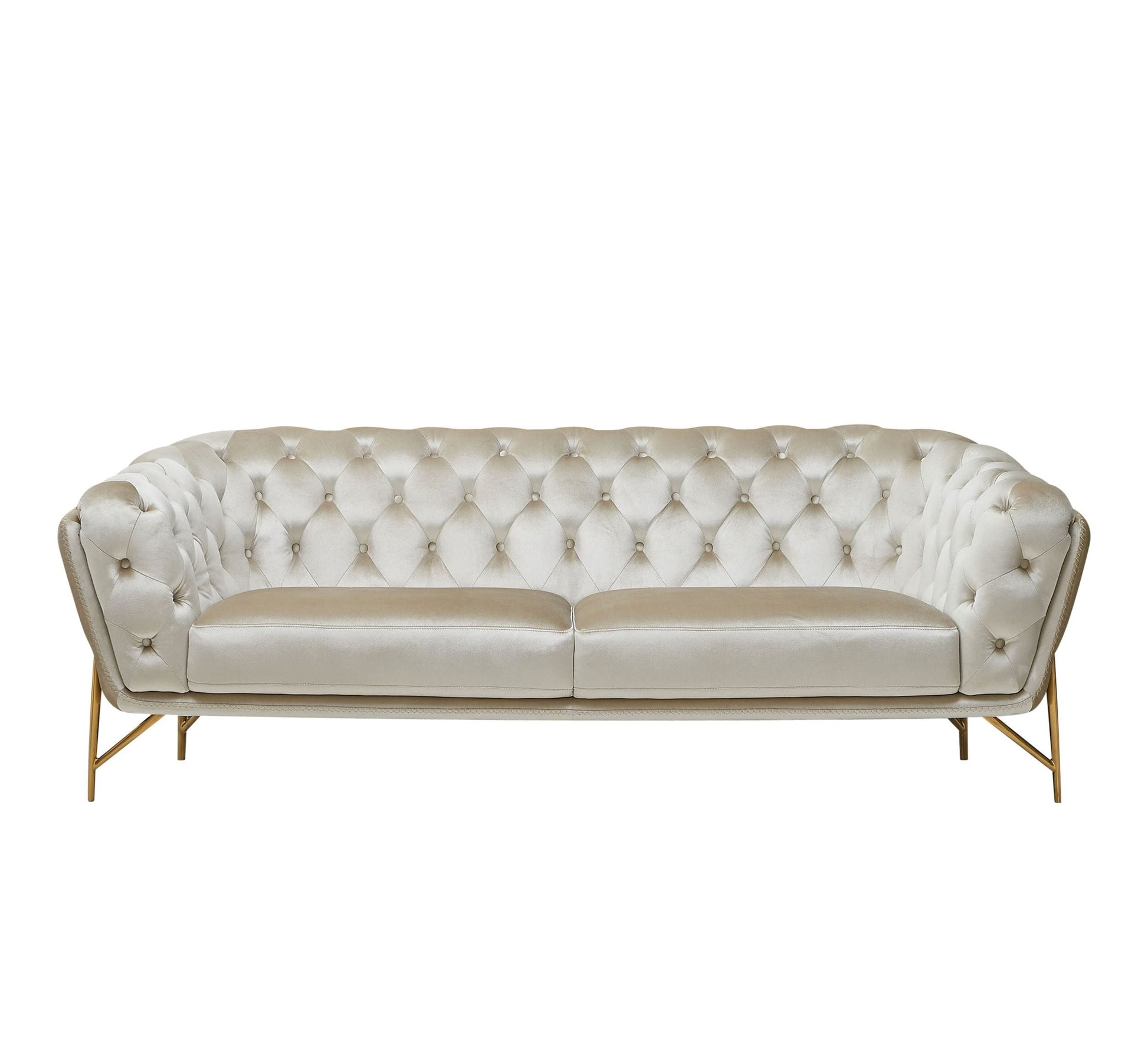 The Stella sofa is a perfect example of glam contemporary style. The soft pearl hue of the velvet upholstery shines in the light and produces an enchanting effect. The back is button diamond tufted to add a luxurious pattern to your piece. A tubular gold frame holds up the exquisite silhouette of this gorgeous sofa. Pair with other Stella pieces for a complete set.