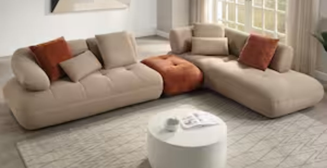 Gorgeous tufted Right facing sectional upholstered in soft beige performance mesh fabric