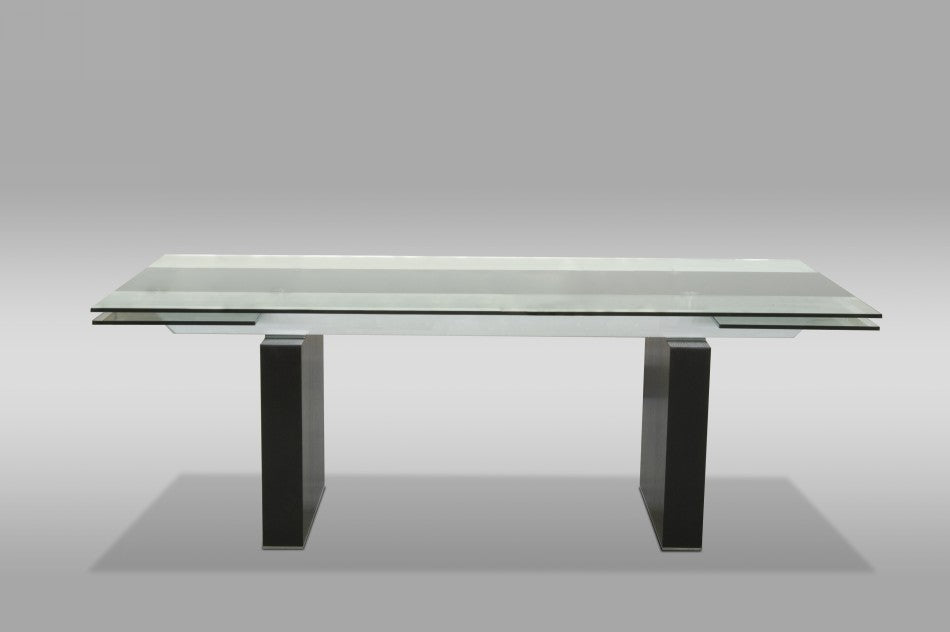 W86.5/122" x D42" x H30"The Lisbon Dining Table is the perfect modern table for your large family. Extending up to ten feet in length, this magnificent table can seat between eight and twelve people, making it an extremely functional option for your home. The dark contemporary wenge finish adds contrast to the crisp clear glass top. Silver inner working of the table are viewable from the top of the piece, inviting everyone into the lovely craftsmanship of this table. Pair with a black vegan leather chair for a perfect pair.