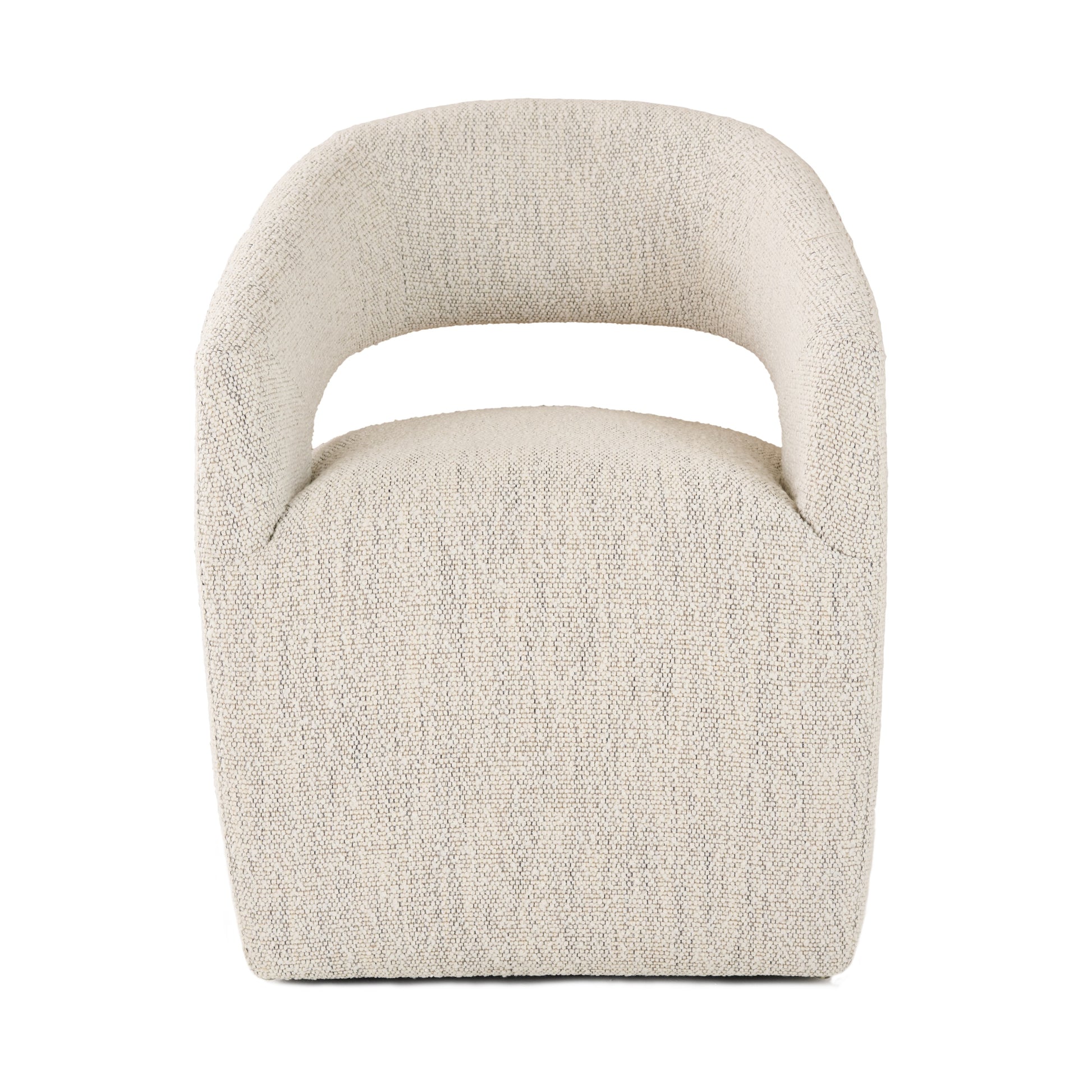 W25.5" x D25.5" x H32"Our Angie Accent Chair has a simple silhouette and contemporary aesthetic with clean lines. With sleek, inviting contours and cut out back that makes for an Art Deco feel. Foam wrapped in a textured cream fabric makes this a desirable choice to brighten any room.