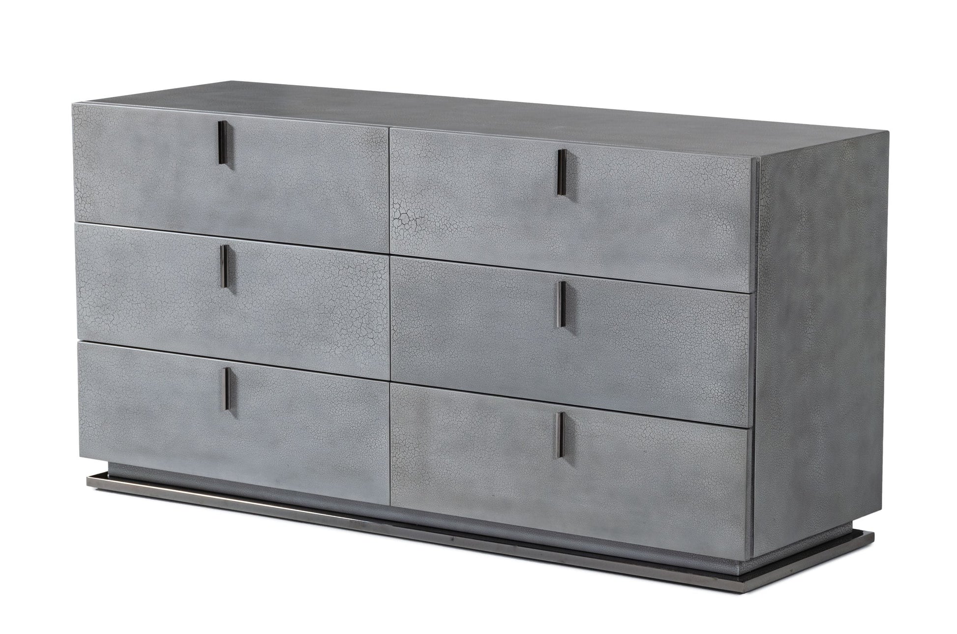 Overall:W59" x D19 x H31"The Buckley Dresser is a very unique item. The crackle matte lacquer finish adds texture and style to any room. The metal handles create a long clean line against the rough finishing and the black gunmetal base adds to the industrial feeling. Pair with a white fur rug and a platform bed for the perfect modern bedroom.