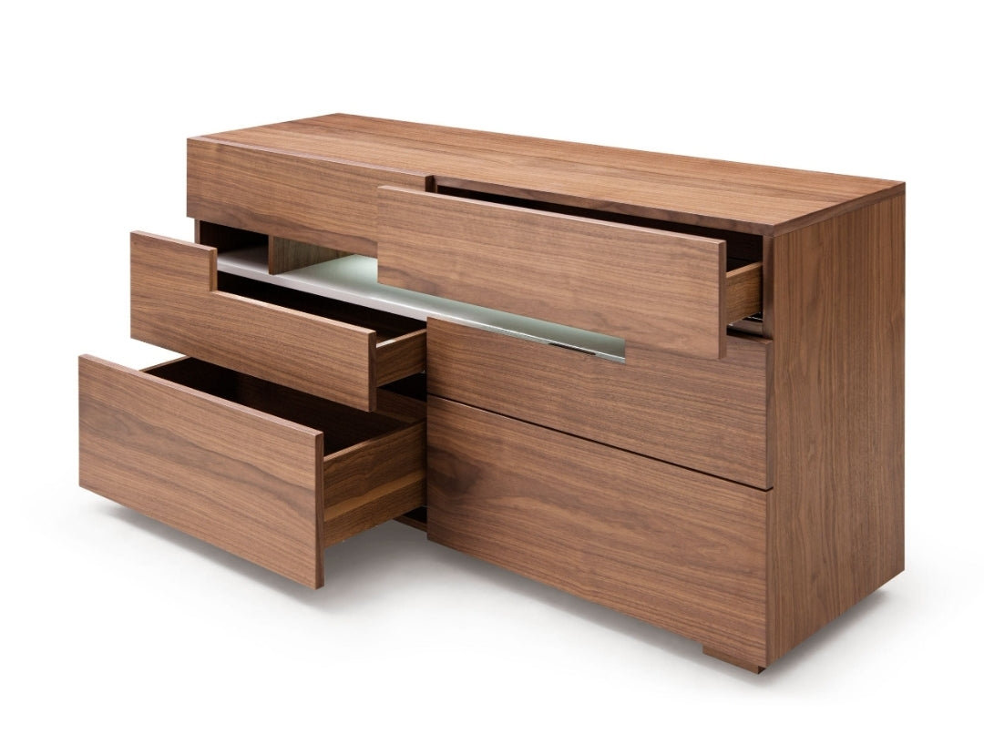 Overall: W55" x D17" x H28"An LED light in the top middle cubby provides not only accent lighting but functional lighting for early morning or nighttime use. Six drawers with silent drawer gliding and soft closing mechanisms administer abundant storage for your clothing. Finished in a walnut wood veneer finish for a warm and contemporary design. Matching set pieces available separately. Also available in a white high gloss finish.