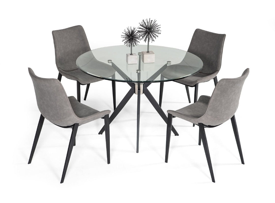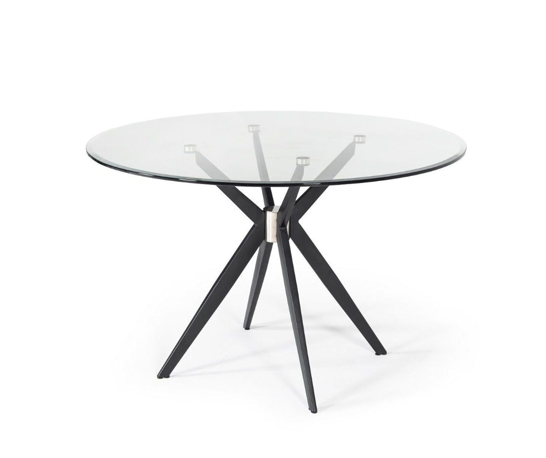 W47.5" x D47.5" x H30"The Dallas Dining table features a 12mm clear glass top, centered over a crisscrossed powder coated metal base, that is held together by a brushed stainless steel cylinder at the legs intersecting point. The table is versatile in style, and can fit in with many interiors that are contemporary, modern, mid-century and industrial, and can seat upto 4.
