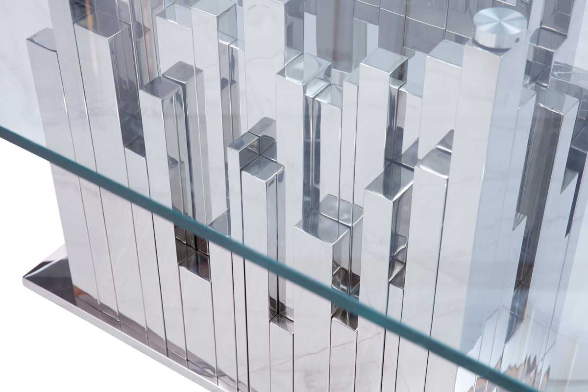 W87" x D43" x H30"A stunning showcase of artistry, the Modrest Edwin Modern Glass & Stainless Steel Dining Table features a 15mm rectangular clear tempered glass top. Amazing architecture is seen on the polished stainless steel base that looks like a group of buildings with different heights provides robust support. Requiring some assembly, this state-of-the-art modern dining table seats 6-8 comfortably and gives your dining room a totally modish look.
