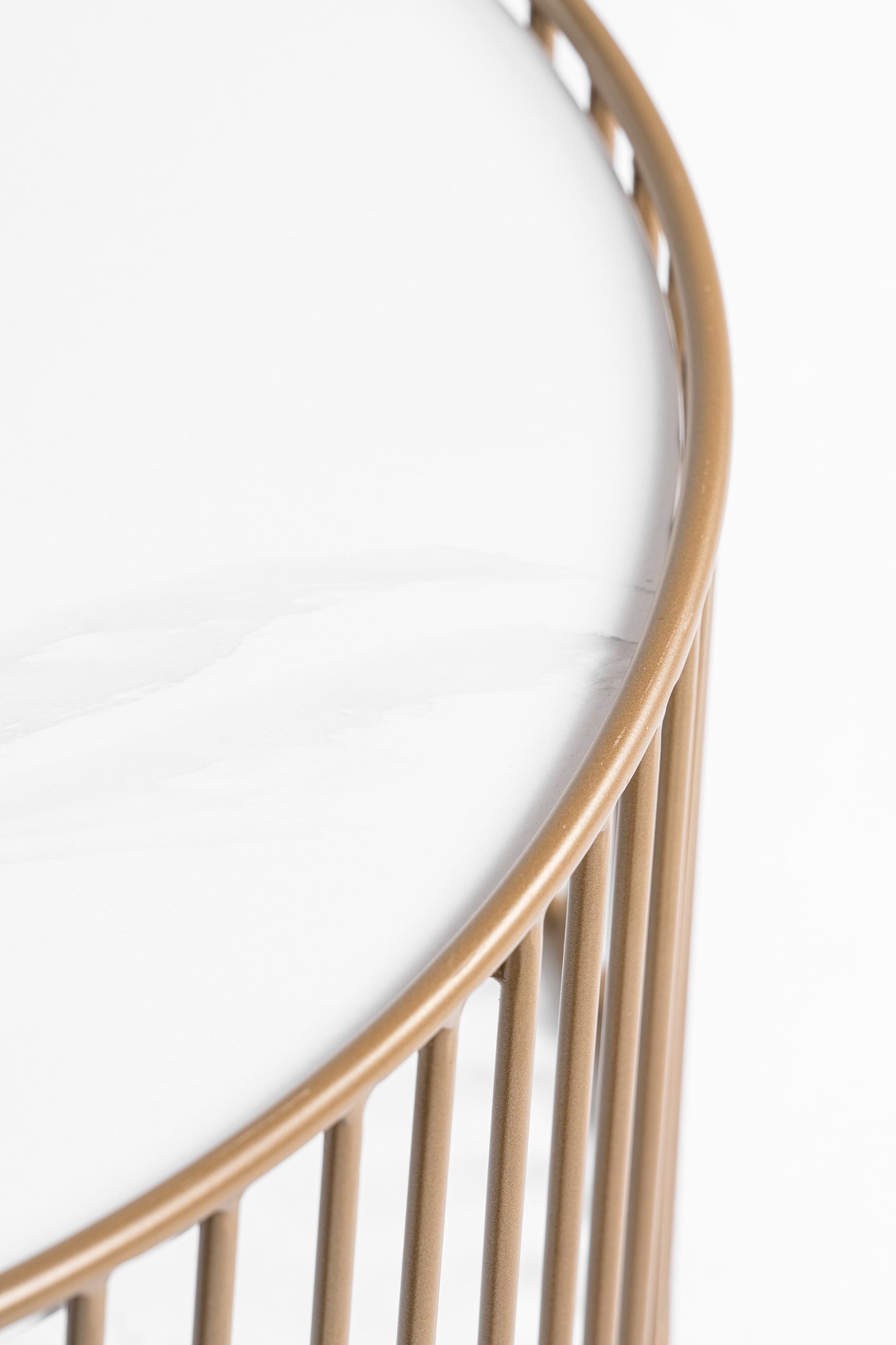 W37" x D37" x H14"Using basic geometric shapes to get an open and airy feel is not a typical descriptor for a coffee table, but that is one place where the Eleanor Coffee Table is anything but typical. The 15mm thick faux marble circular top contrasts with the linear base frame made from gold powder-coated tubular metal to create a unique and supportive table. Add a touch of modern flair with this unique table in your home,