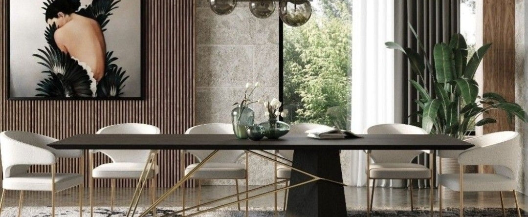 W126" x D43" x H30"This table sports a stunning abstract design with Matte Black Ash Wood top wood and combination wood-metal base that offers a stylish and unique dining experience. Seats up to 12 people, perfect for family dinners and the holidays!