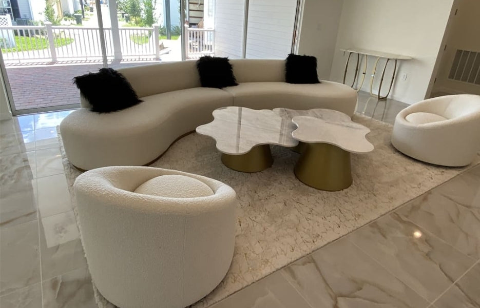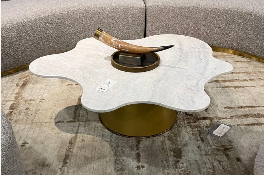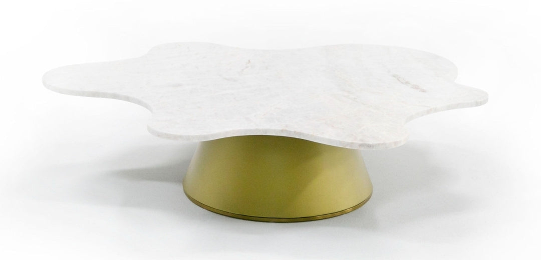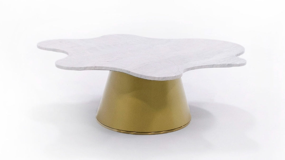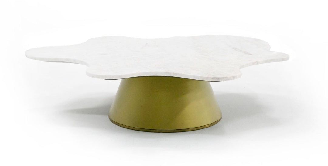 W47.3" x D43.3" x H12.2"Unique glam inspired piece meant for hollywood. A conical base is finished in a brushed gold to add as much luxury as possible while the amoebas marble top adds a modern style like no other. This contemporary piece is truly unique and sure to impress.