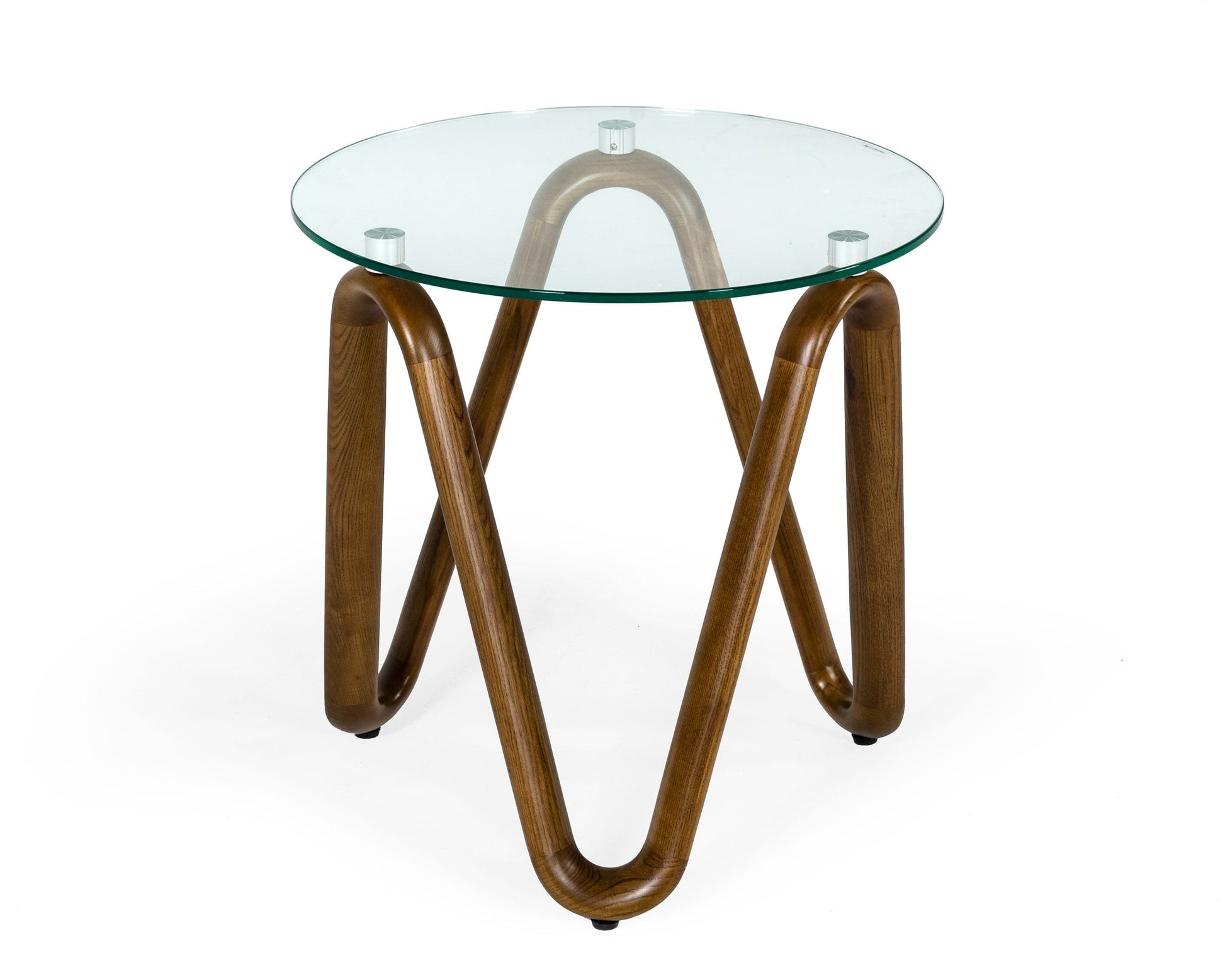 W20" x D20" x H20"The wooden base creates a sinuous serpentine path just under the surface of this gleaming coffee table. The Lassen End Table is a perfect accent piece for your mid-century modern space. A 10 mm tempered glass top is perfectly attached to this wave like base to create an extreme style with tons of potential. Pair with a hide rug and woven side chair for a perfect pairing.