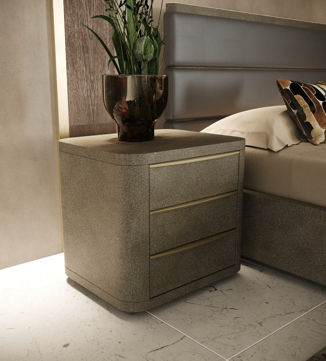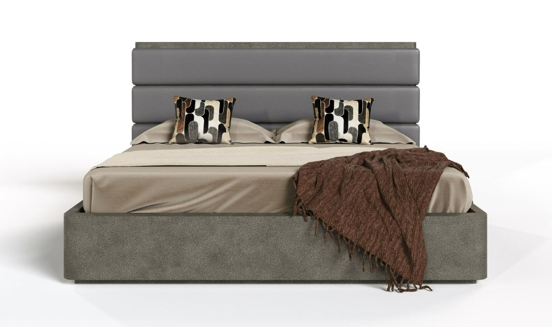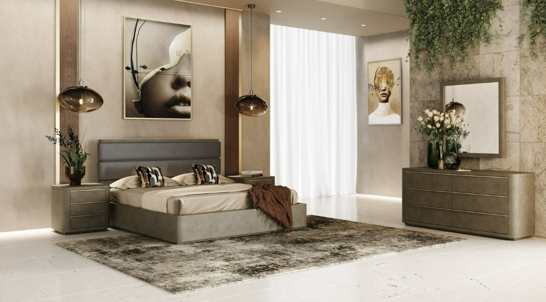 Modern Grey Leather & Beige Shagreen Bedroom Set