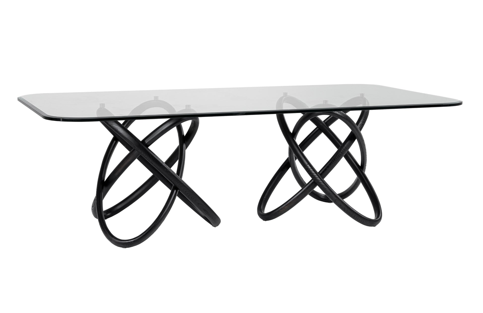 W94" x D47" x H30"The Modrest Mason Modern Glass & Black Ash Dining Table exudes ingenuity featuring an intersecting spherical black finished solid ash wood base that reminds of a modern art display. A clear glass top sits along the top as if floating. This Zen table is sure to shine in a modern, contemporary, or mid-century style home. Pair with any of our Mid-Century dining chairs for a perfect match.