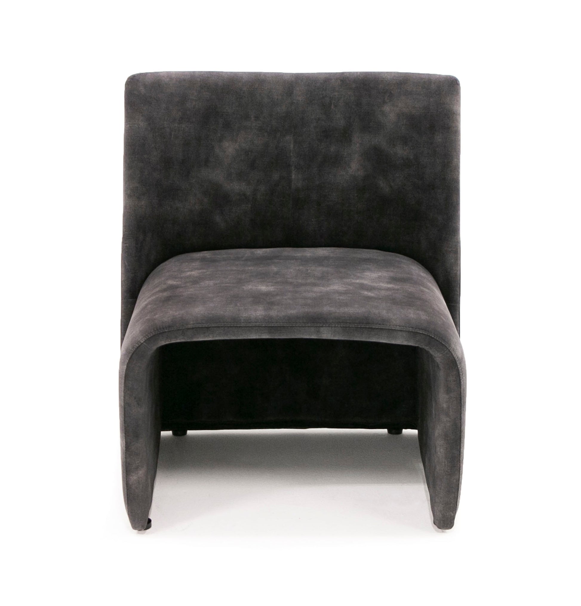 Instantly make an impression with the sleek and cool Jarvis Accent Chair. Whether furnishing an industrial loft, or a contemporary home, Jarvis will add instant class and comfort with its curvilinear shape and dimension through it's use of distressed gray fabric. The armless minimialist design adds to the light feeling and makes for a perfectly subtle statement.