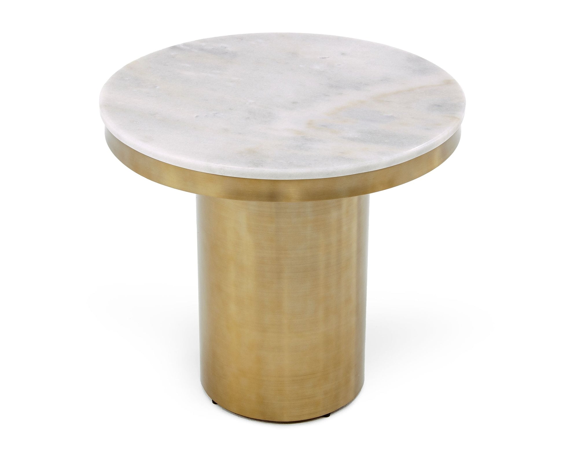 The Rocky EndTable is the perfect mix of modern and glam. The round stone top is elegant and unique and it contrasts the polished gold stainless steel of the base. Perfect with a velvet tufted sofa for a luxury look.
