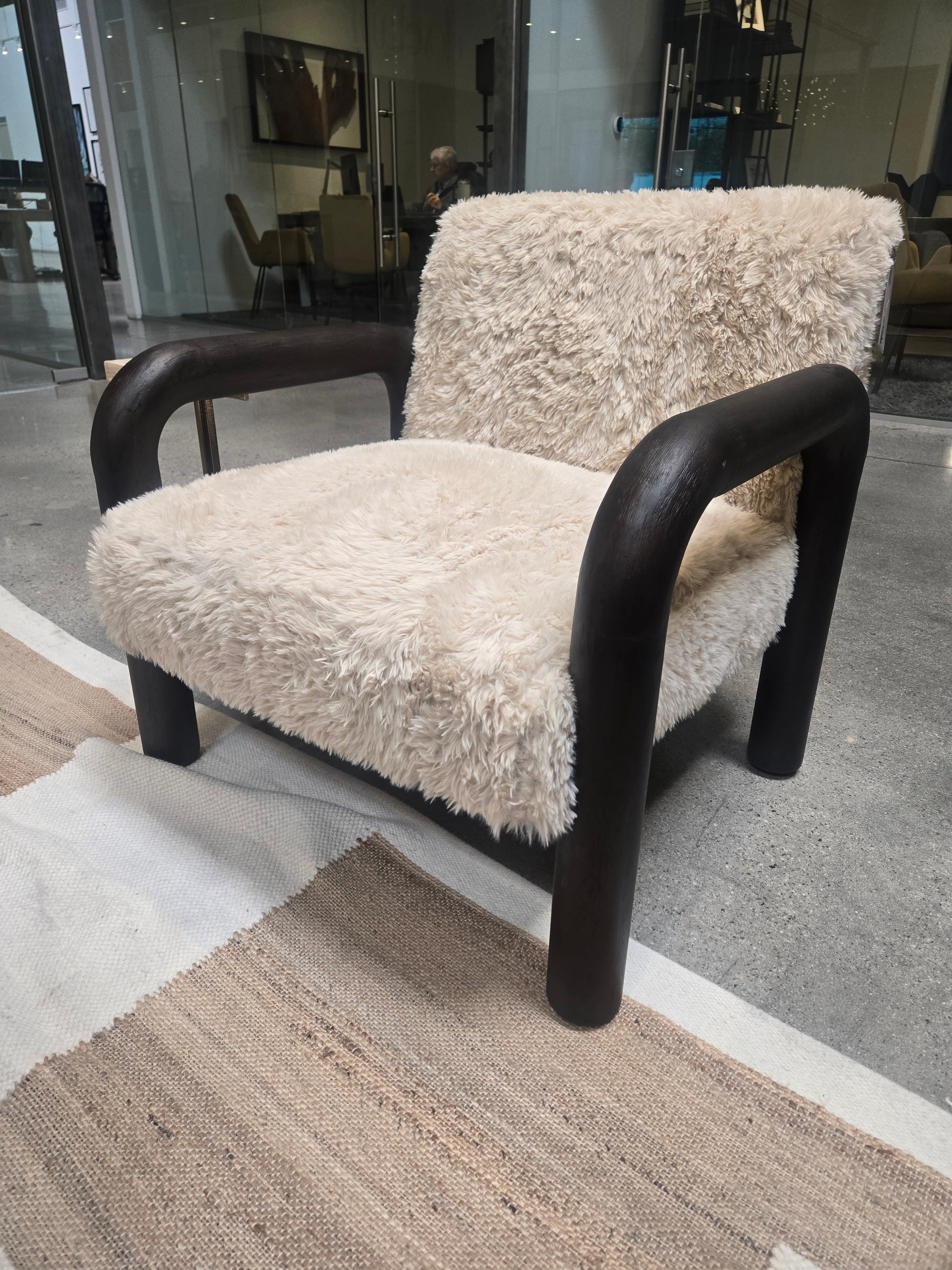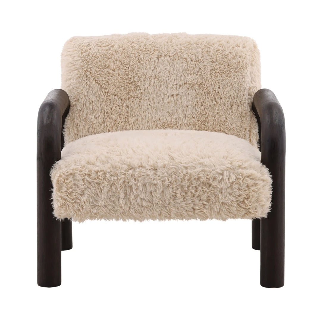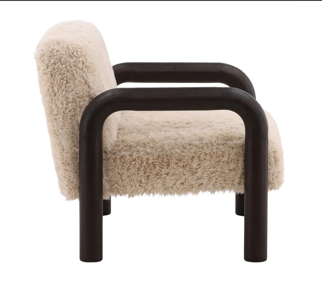 Cozy stylish arm chair with faux fur upholstered seat and back in a light sand color, and sturdy espresso brown rounded wood frame.