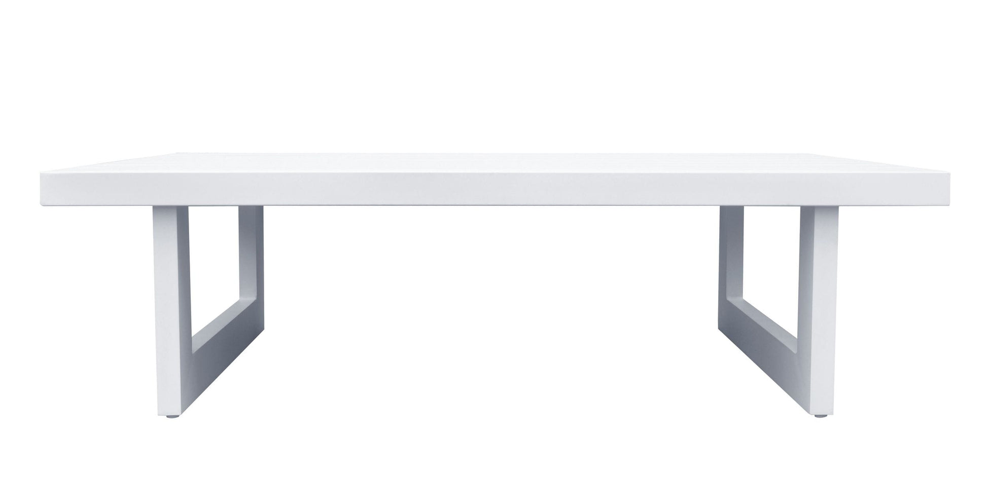 The Wake Outdoor Coffee table brings the set together is wider to match the length of the sofa. This off-white aluminum coffee table has a soft look while maintaining its elegance.